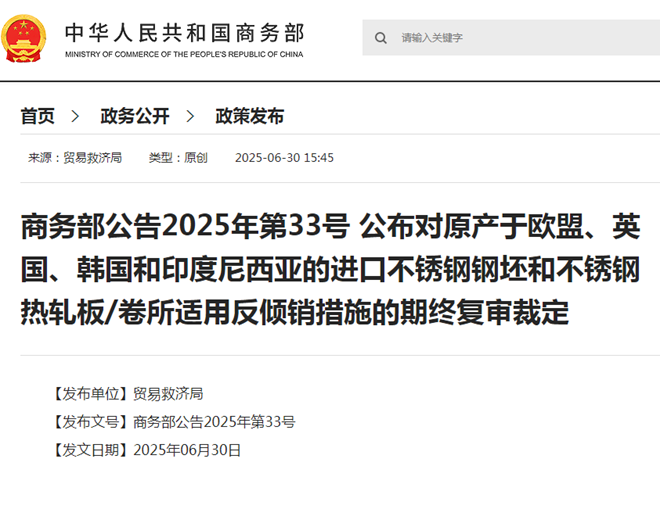6月30日,商務部發布公告,公布了對原產于歐盟、英國、韓國和印度尼西亞的進口不銹鋼鋼坯和不銹鋼熱軋板/卷所適用反傾銷措施的期終復審裁定。